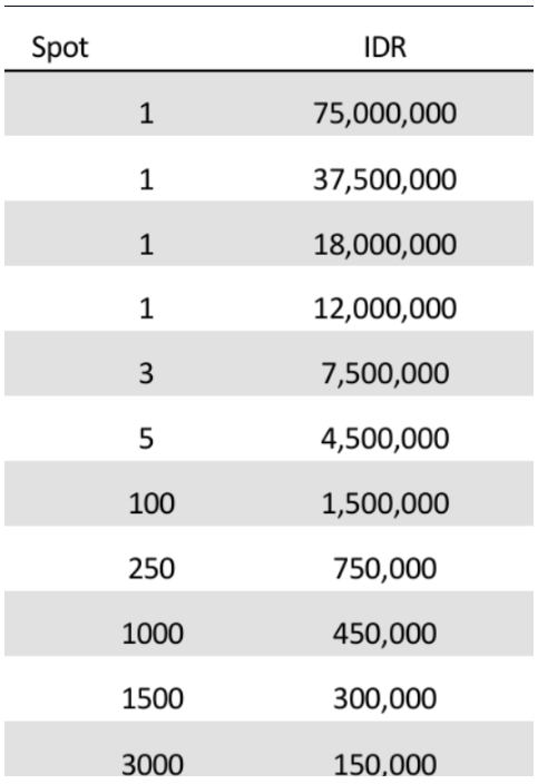 2. Total Hadiah Event ini adalah sebesar Rp 8.560.500.000 yang akan dibagikan kepada seluruh pemenang Tournamen